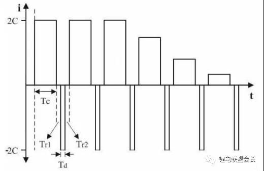 Sheng-Yuan Ou和Jen-Hung Tian对Reflex快速充电方法进行了研究,充电曲线如图5所示,在每个充电周期中,先采用2C的电流充电时间为10s的Tc,然后停充时间为0.5s的Tr1,反向放电时间为1s的Td,停充时间为0.5s的Tr2,每个充电循环时间为12s。随着充电的进行,充电电流会逐渐变小。实验证明,这种充电方法可以使单体锂电池的充电时间提升到40min,电池温度仅仅升高1.1 ℃,充电效率达到87.51%。